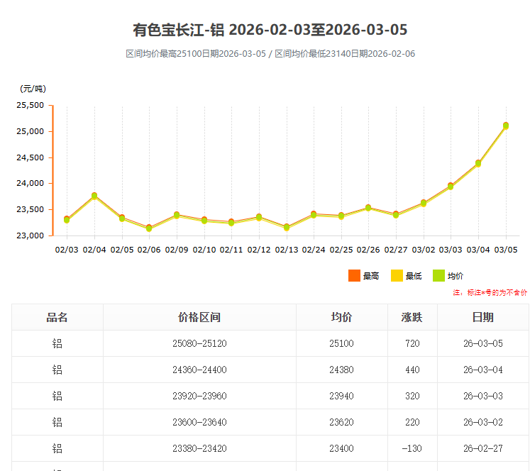 進(jìn)入2026年3月,國內(nèi)鋁錠價格迎來新一輪強(qiáng)勢上漲。根據(jù)長江有色網(wǎng)最新數(shù)據(jù),3月5日鋁錠均價已飆升至25100元/噸,單日漲幅高達(dá)720元,創(chuàng)下近階段新高。這一劇烈波動不僅牽動著上游電解鋁企業(yè)的神經(jīng),更對下游工業(yè)鋁型材 加工行業(yè)帶來了嚴(yán)峻的成本考驗(yàn)。